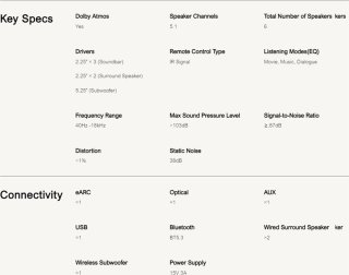 - Drivers: 2,25" × 3 (soundbar), 2,25" × 2 (surround), 5,25" (subwoofer)